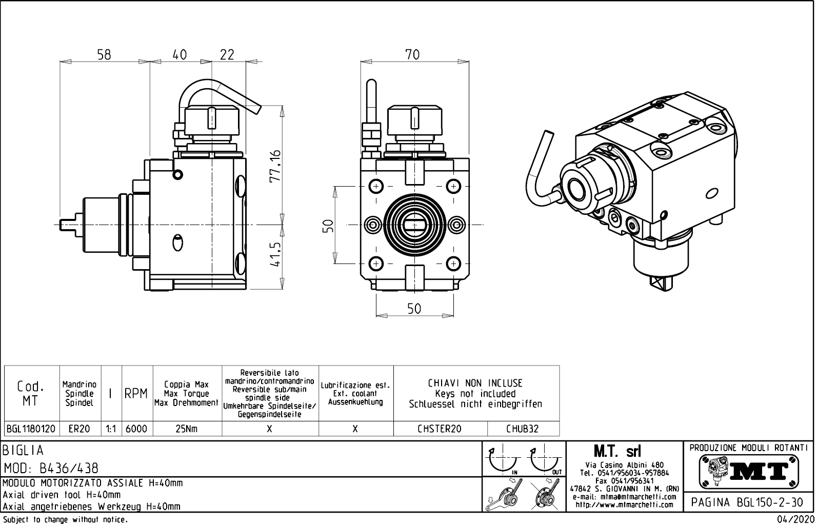 Axiální rotační držák nástrojů pro stroje s nástrojovou hlavou BMT40.