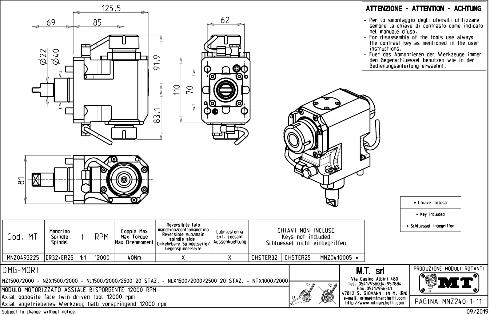 Axiální rotační držák nástrojů pro stroje DMG Mori s nástrojovou hlavou BMT40.